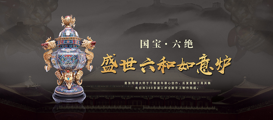 《国宝六绝·盛世六和如意炉》为六方鼎式熏炉,由盖、颈、腹、足、翼几部分组成,高66厘米,宽48厘米,是张同禄大师于千禧龙年潜心创作,反复推敲十易其稿。张同禄大师结合了景泰蓝、金属铸錾、花丝镶嵌、玉雕、宝石镶嵌5大工艺门类,大小部件400多个、10次入窑、使用30多种釉彩、耗费掐丝长度近千米,镶嵌10类天然名贵宝石160多颗,先后共300多道工序全部手工制作而成。
