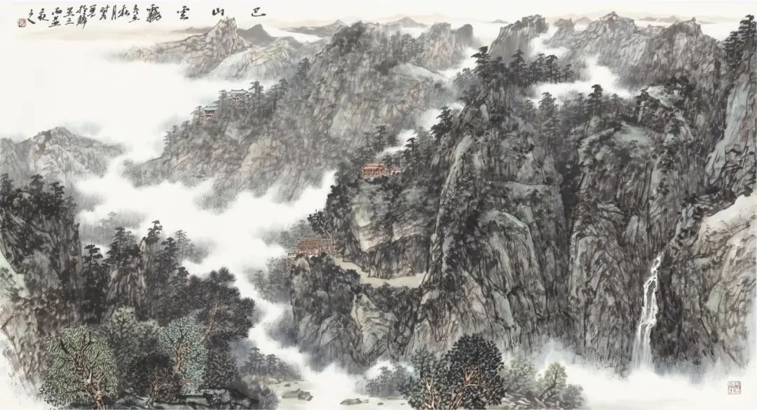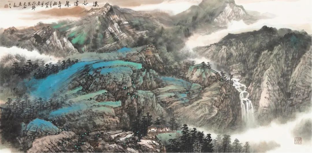他的山水画的力量来源于他笔墨语言的厚度与深度;来源于他画面结构的开合与风骨。他将传统皴法的披麻、斧劈、雨点、乱柴等综合运用,层层皴擦叠加上层层点染,显得厚重深邃又灵动丰富。墨法上更是精妙,他沿用了黄宾虹的“七墨法”,浓、淡、破、积、泼、焦、宿,使得画面呈现出丰茂华滋、苍茫深厚的质感。张大千先生的青绿泼彩在画面中也被发挥得淋漓尽致。