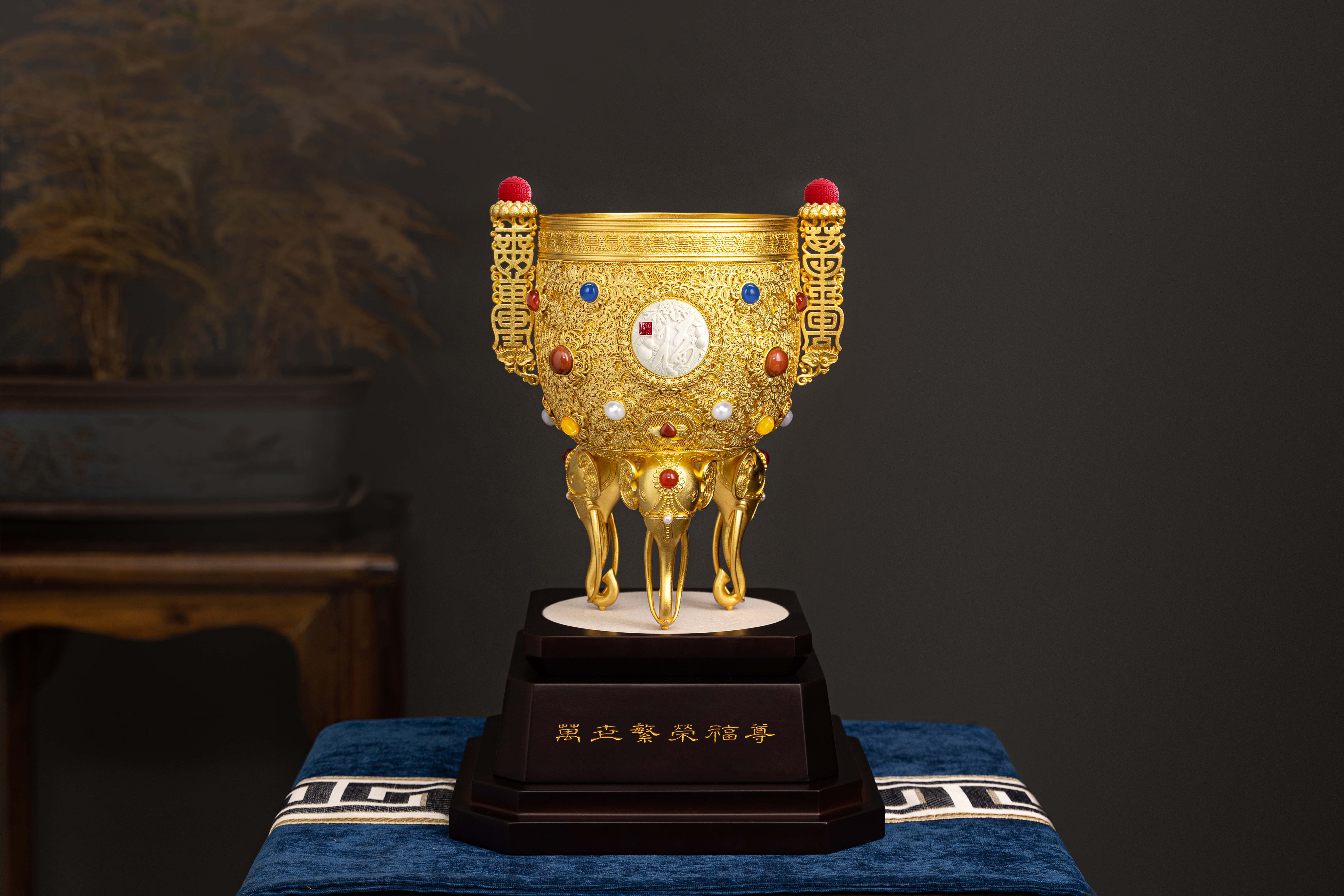 《万世繁荣》福尊以故宫珍宝“金瓯永固杯”和“金嵌珍珠万寿无疆杯盘”为设计蓝本,前者是乾隆皇帝为江山社稷、为万民祈福的专用酒具,后者是皇帝寿辰时的御用酒杯。将两者巧妙结合,以全新理念再次创作,用精湛的工艺设计制作,赋予《万世繁荣》诸多美好祝愿,为国家为人民祈福,慈荫尊者福寿。
