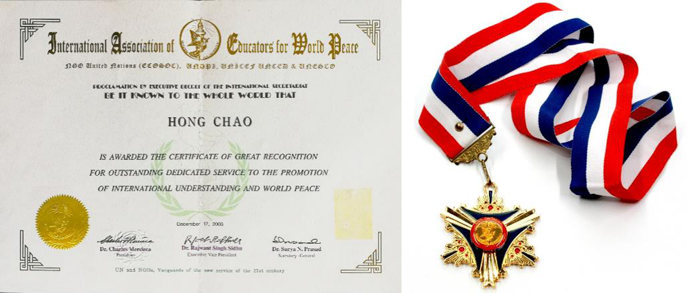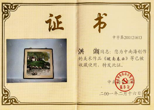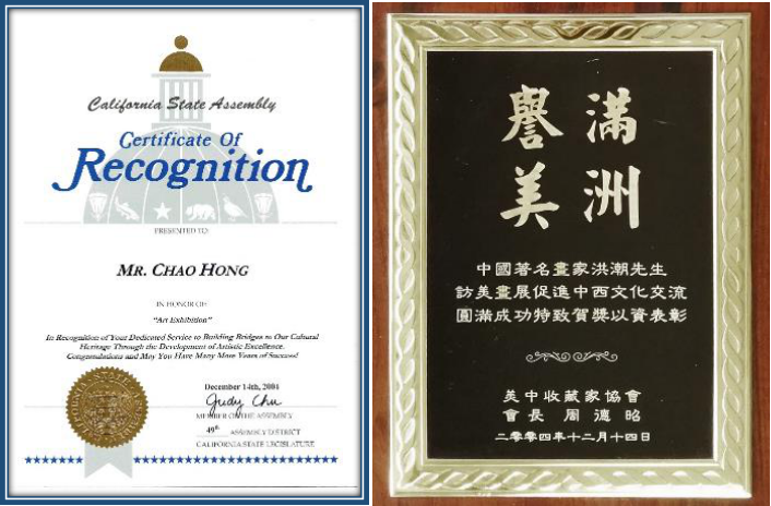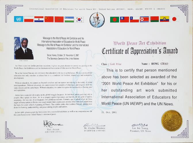 2003年,洪潮先生因突出的艺术成就,荣获联合国“世界和平教育最高奖”及勋章