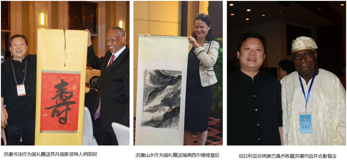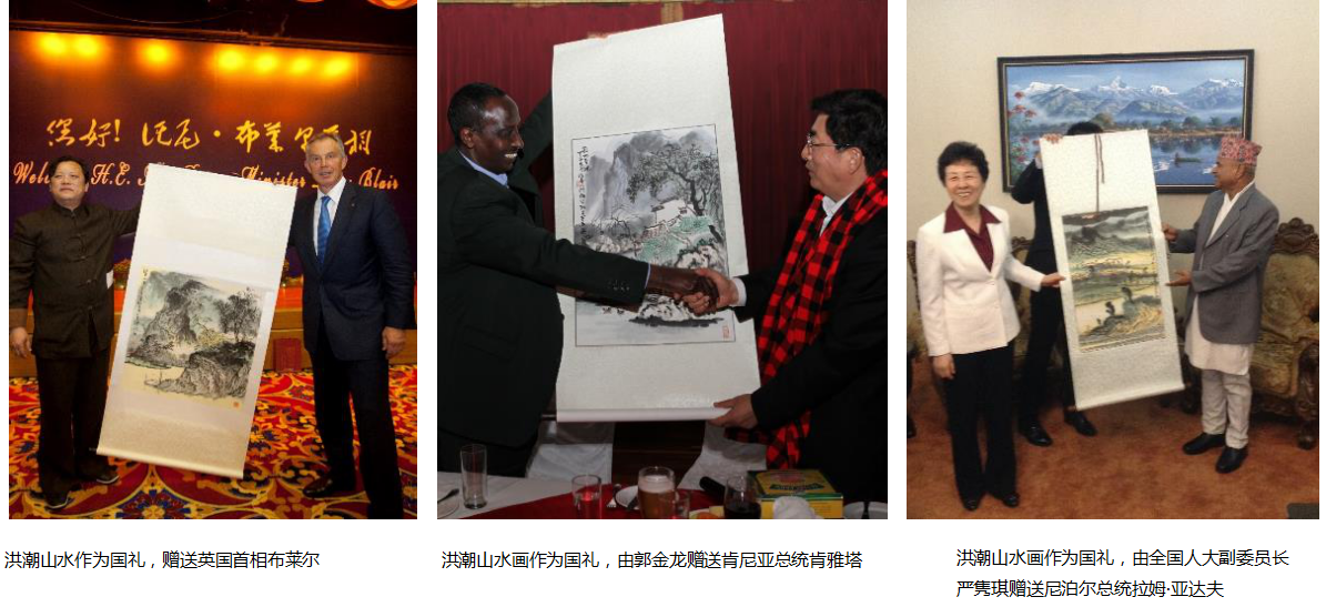 今天,洪潮的山水画以强烈的艺术感染力,展现民族之风范,国家之气度,已然成为超越于当代绘画的艺术水准,屹立在画坛巅峰,进而成为“国礼山水画名家”!