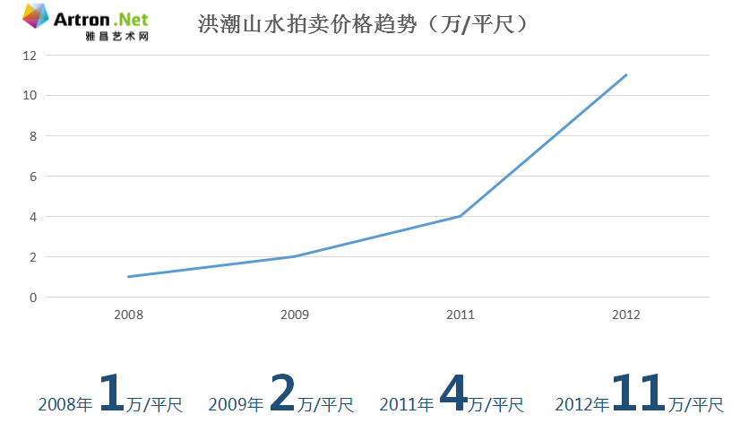 洪潮山水画屡次上拍,价格一路飞涨,连年翻番,最高拍出11万元/平尺!
