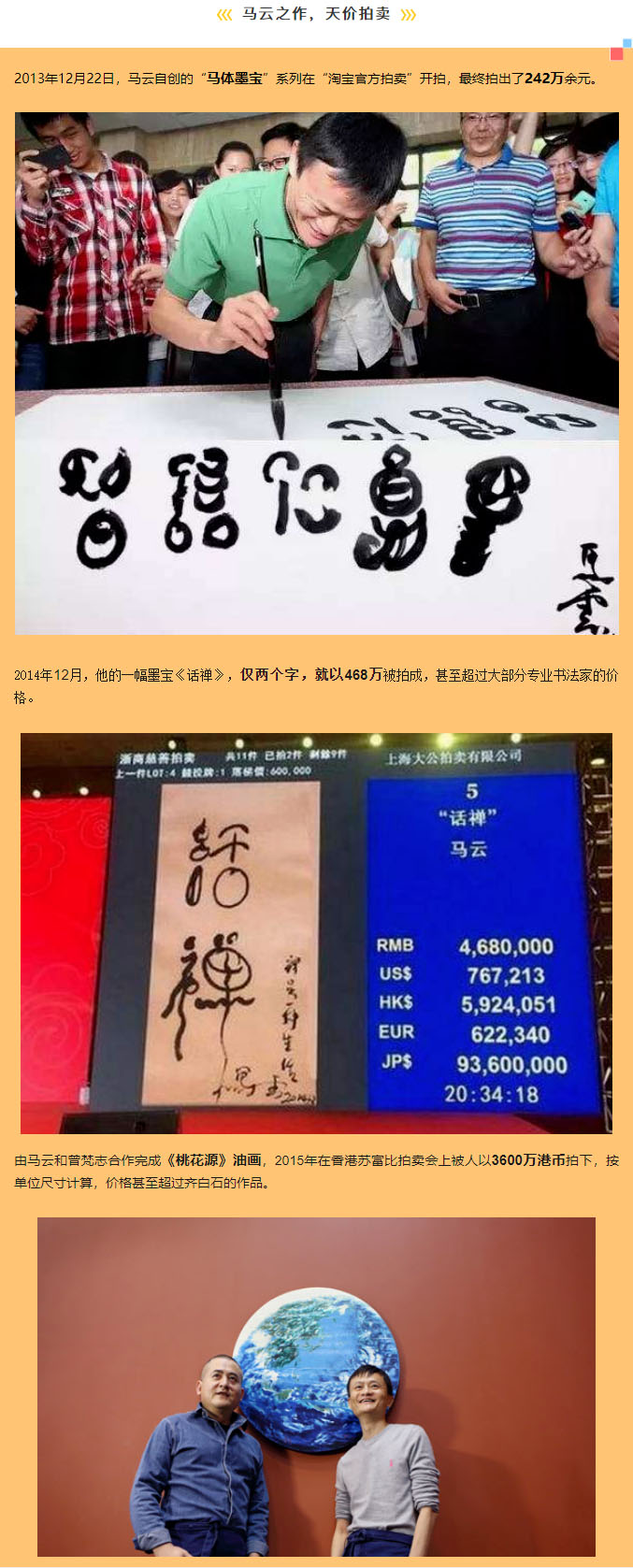 马云不仅以手中的财富不断在各大顶级拍卖场中豪掷万金,更是亲自参与艺术创作,甚至与名家大师联手创作,在艺术拍卖中不断进行卖家与买家的身份转换,赚了个盆满钵满。