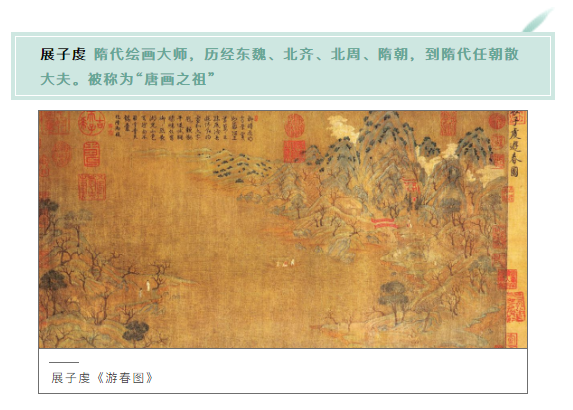 隋唐时代,山水开始从人物图中走出来,成为独立的画作主题,展子虔的《游春图》是迄今为止存世最古老的山水画,成为了青绿山水的开山鼻祖。