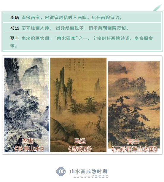 南宋时期,山水画风格由宫廷画派的发展壮大,逐渐形成华丽细腻的院体风,以皇室宫廷画家李唐、马远、夏圭为代表,在展现画作内容时,注重细节刻画,极具皇家的华贵与庙堂之气。