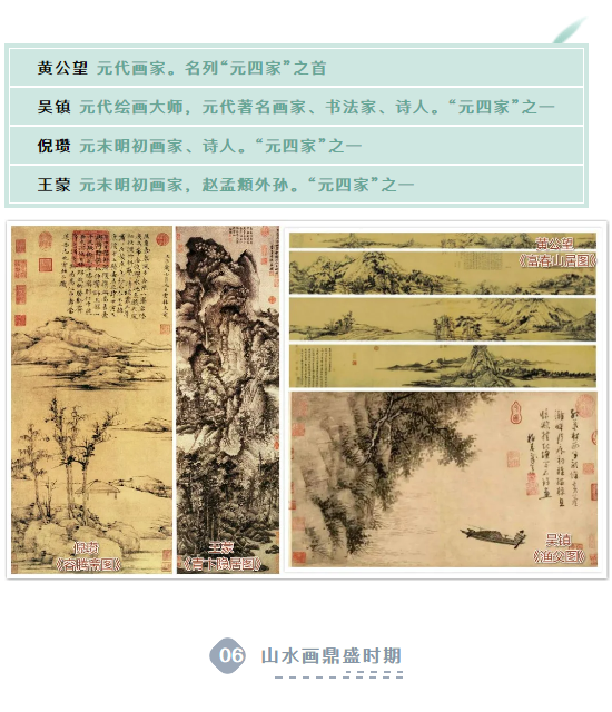 元代山水画开始形成以形写神的表现形式,注重以物言志的主题内涵。以黄公望、吴镇、倪瓒和王蒙为代表的画家对后世山水画的演变和发展有着重要意义。