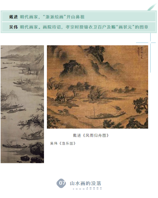 明代由元代文人山水画风格达鼎盛时期,从追求以形写神到力求形神兼备,从以物言志到致达天人合一的精神,明代山水画融入儒道与哲学,对山水画追求至高的思想境界产生了深远的影响。