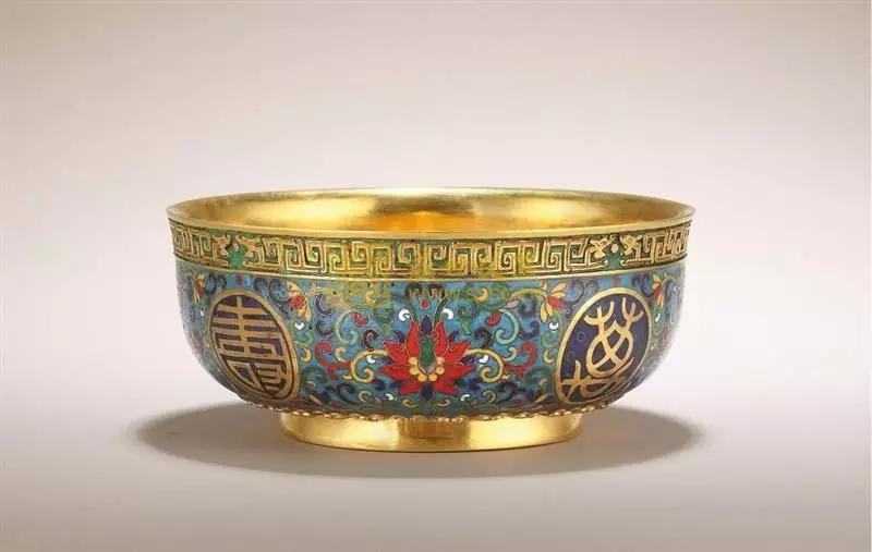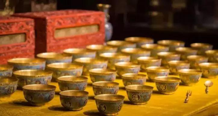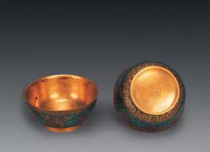清宫档案记载,“万寿大宴上唯有乾隆一人使用全套景泰蓝碗、盘餐具,余者都用瓷器。”自此,这套掐丝珐琅勾莲纹《万寿无疆》碗、盘几乎成了“乾隆”的标志。有“乾隆”处必有此器,有此器必为皇帝专用。故宫、沈阳故宫、避暑山庄几处重要的皇家行宫,皆配制了此套餐器,作为帝王的“万寿无疆”的象征。