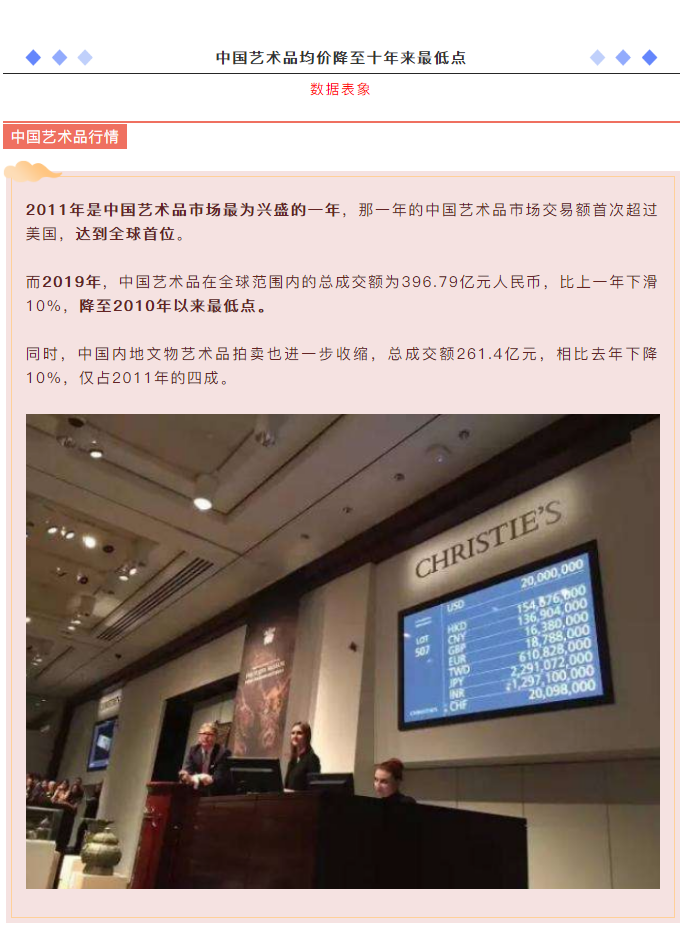 中国艺术品价格经历多年上涨之后,2019年拍品均价下滑明显,降至2010年以来最低点。看起来似乎形势不容乐观!
