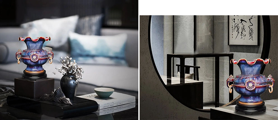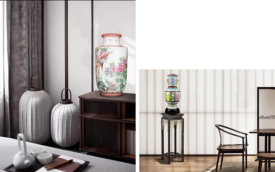 但切记,花瓶无论是放在哪都不要落地,瓷为玉,玉有仙气,不可沾染尘埃,一定要放在地面上的话,可以在下面放一个专用的瓶托。