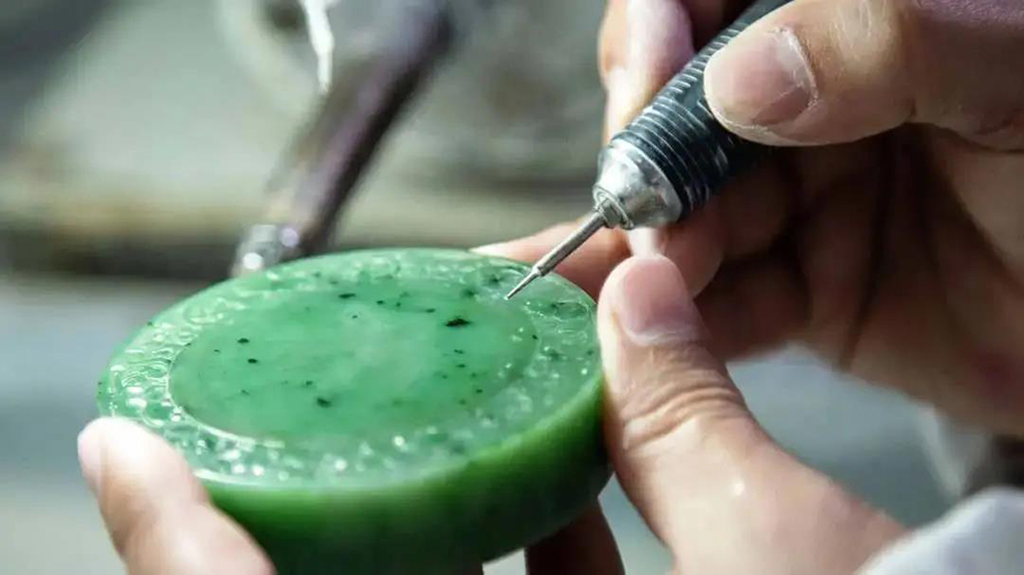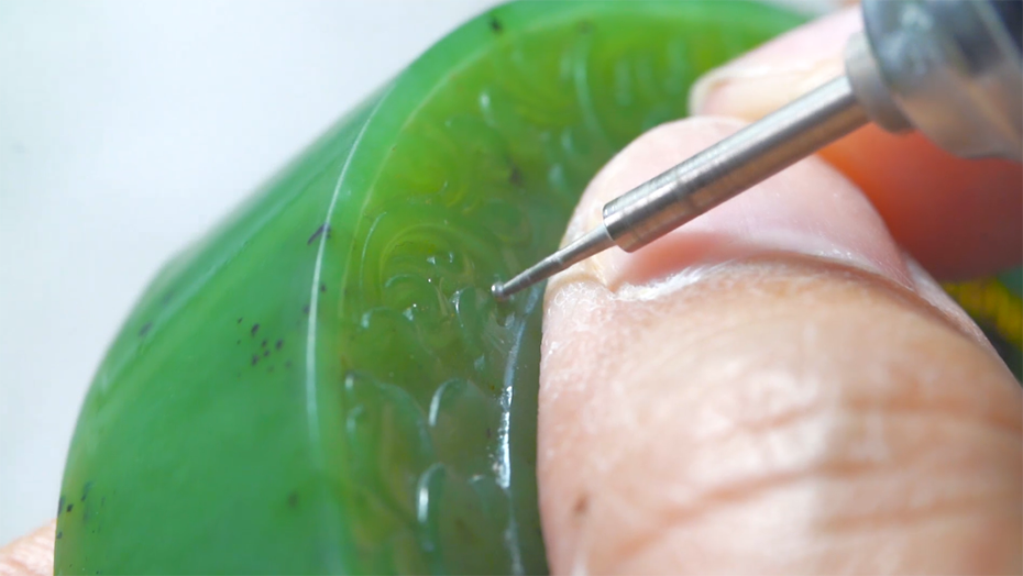 此次和田玉的雕刻采用了浮雕、阴刻等多样的雕刻手法。因为金镶玉瓶瓶身和田玉部分呈圆形,不好把控,纹样图案多而细密,雕刻时非常考验功力。最后经过手工找细、抛光等工序修整,才能展现和田玉石纹样清晰灵动,流畅自然的工艺效果。