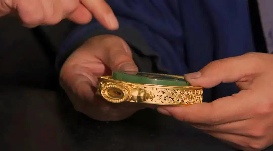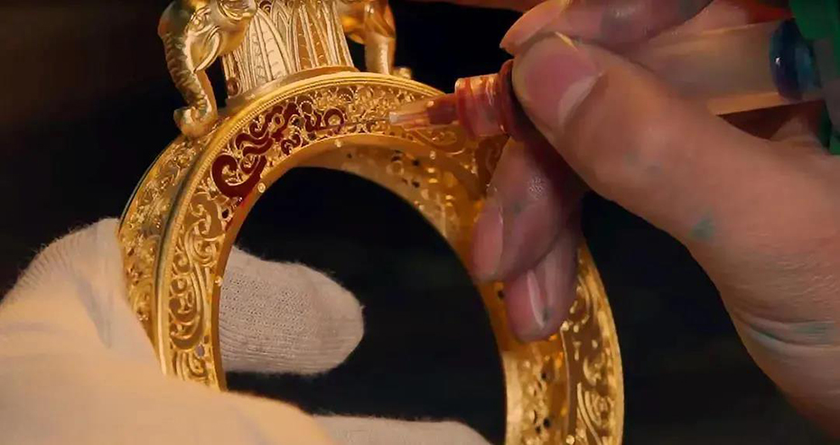它首次融合了金银浇铸、玉雕、珐琅、花丝、金镶玉五大工艺于一体,“十八般武艺”汇集一身,才造就了它的华美、尊贵、精巧。
