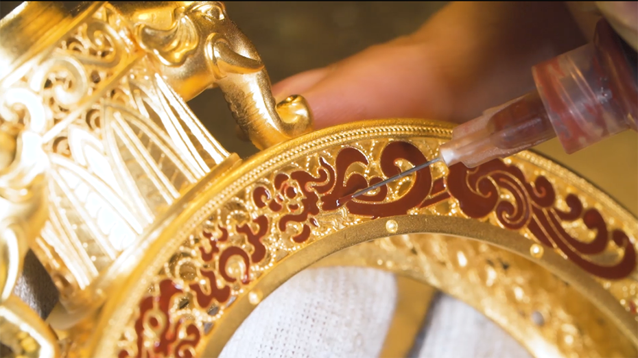 《冬奥金镶玉瓶》的珐琅制作,需要将精心调制的珐琅釉料滴注到图案纹样中,经过严格控温加热后,才成就其鲜艳绚丽的工艺效果。