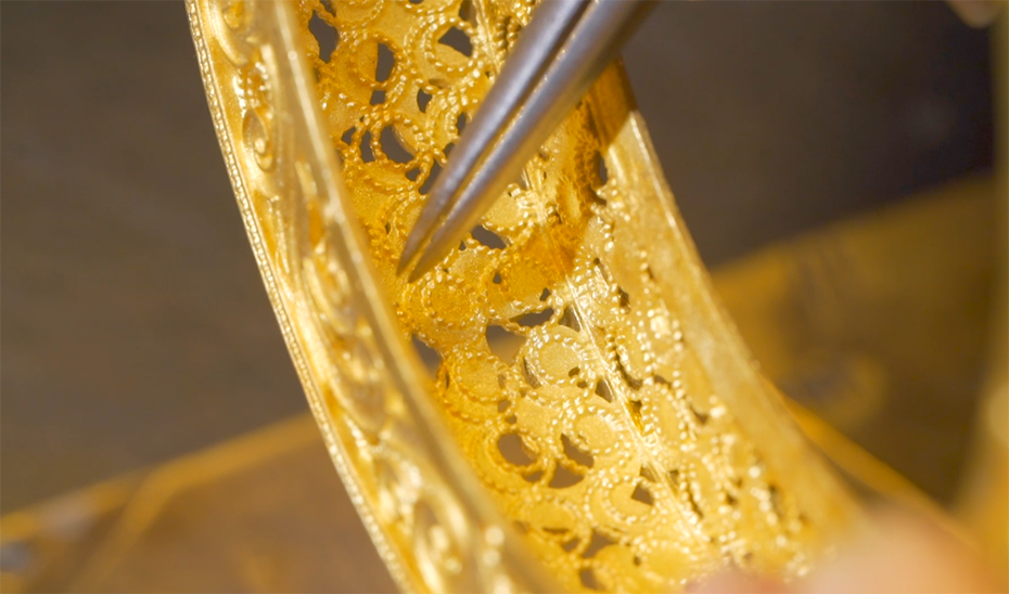 花丝工艺又称为细金工艺、累丝工艺,是将金、银等抽成细丝,以堆垒、编织等技法制成,为宫廷御用的皇家绝技,现已列入国家级物质文化遗产。