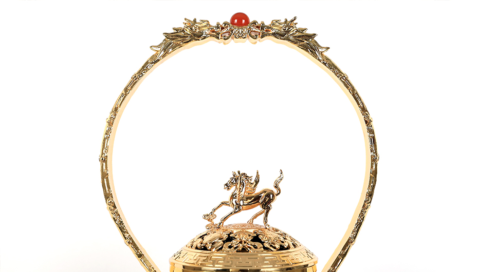 《九州万方》吉祥如意尊整体工艺采用传统的景泰蓝语言和青铜器的饕餮纹,并结合了金属錾刻、花丝镶嵌、宝石镶嵌、玉雕等燕京八绝工艺,瓶身主题画面为泰山,山顶一轮红日,祥云缭绕,山下牡丹花团锦簇,青松翠柏刚劲屹立, “五岳之首”泰山,是中华民族的象征,是灿烂东方文化的缩影,泰山自古便被视为是社稷稳定、政权巩固、国家昌盛、民族团结的象征,产品的名字取意于此,天下太平,九州万方,更是诠释了九大传统吉祥元素。