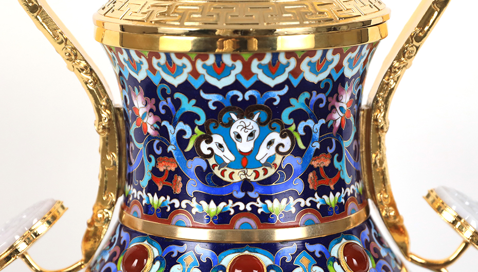 作品采用古青铜器提梁卣的造型,集掐丝珐琅、镶嵌、玉雕等顶级工艺于一身,加上金属錾刻、烧银蓝等复杂繁缛的金属工艺之大成,器形硕大、挺拔,清新壮丽,气势恢宏,美轮美奂。整体纹饰结构分9个层次,分别是如意纹、莲花纹海水江崖纹、宝相花纹、饕餮纹三多等传统纹饰。