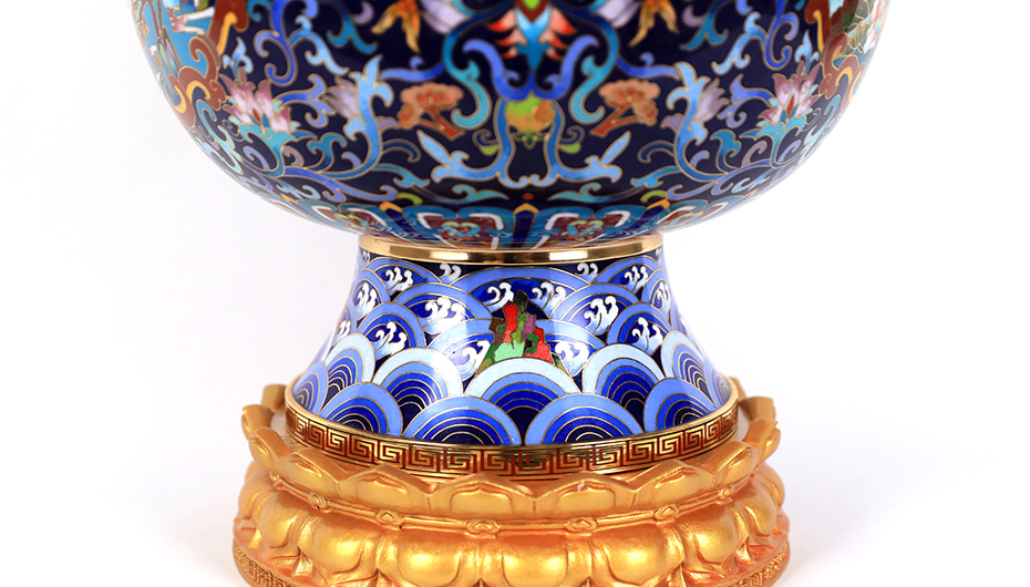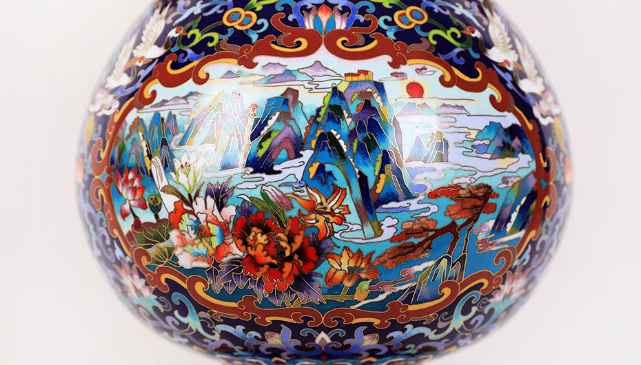 《九州万方》吉祥如意尊器型端庄优美,细腻流畅,釉质胎温润如玉,胎体厚重。瓶体以紫铜为胎,沿袭古代皇家御用制作手法,严格按照制胎、掐丝、点蓝、烧蓝、打磨、镀金等六道传统手工工序制作而成,四次入窑烧制,釉料一点一点加厚,每烧一次漂亮一次,四次涅槃终成大器。