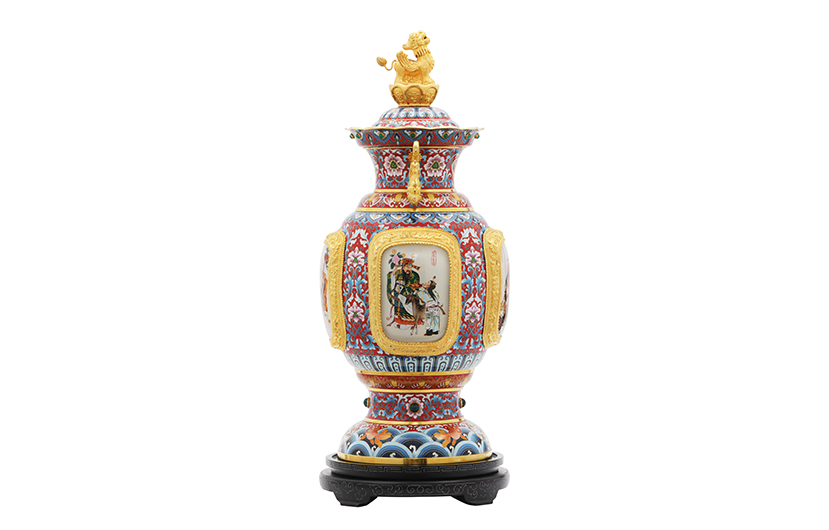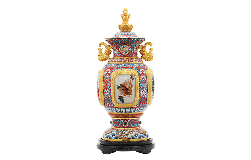 整尊器型采用故宫经典尊贵大器型,饰以如意纹、宝相花、海水纹、缠枝纹等四面开窗以内画绘制福禄寿喜画面,采用王习三首创内画撕毛技法,人物眉目传神,发丝、胡须根根分明顶部錾刻瑞兽貔貅,貔貅坐落于八方来财的莲花宝座之上,招财聚宝即是财,福禄寿喜财,五福聚齐,寓意人生五福圆满,家庭幸福。