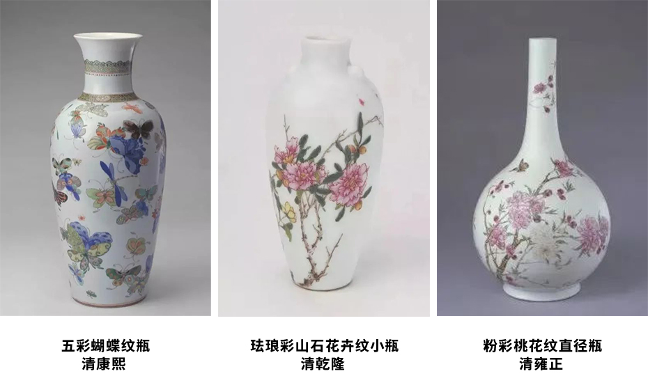 清代康熙、雍正、乾隆三朝著名的宫廷御用瓷器,其工艺繁复:先在已烧好的素面胎上涂彩作底,之后在底色上加彩绘纹饰,在经炉火烧制而成。