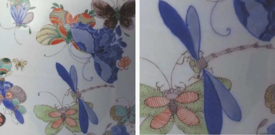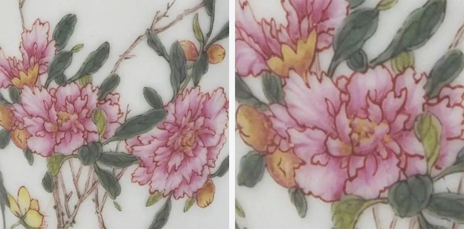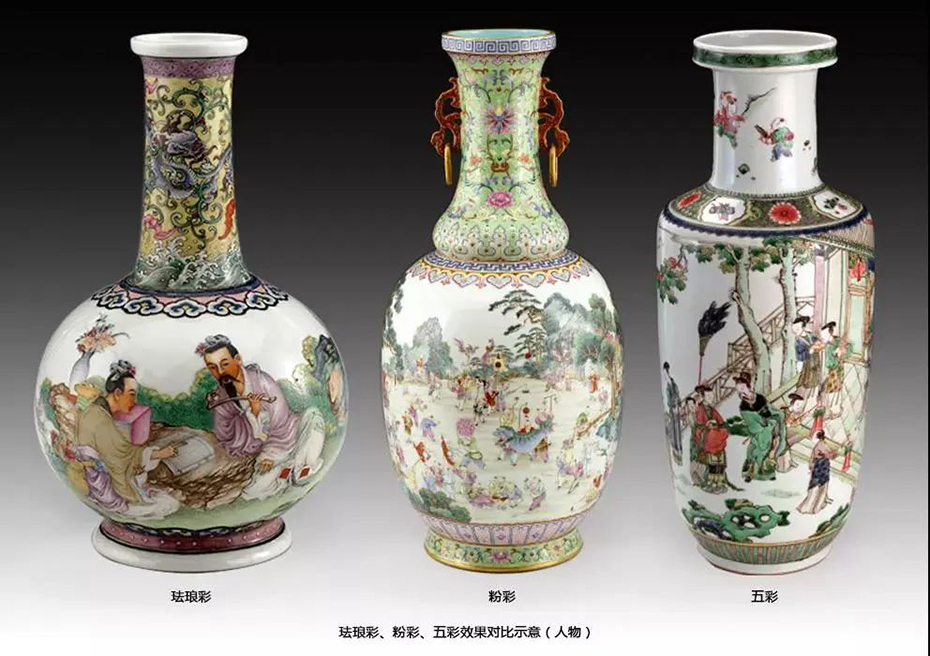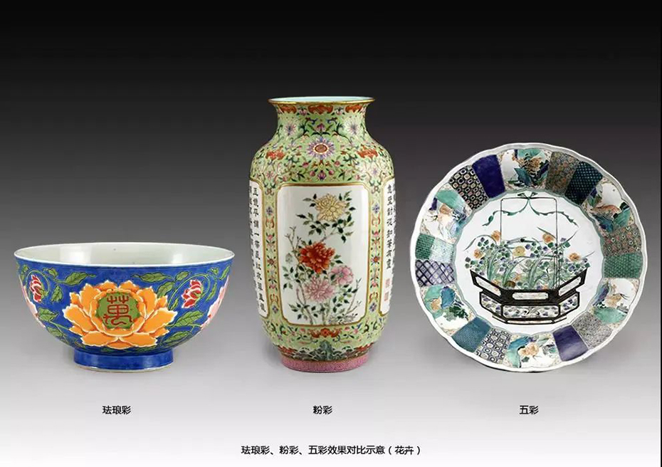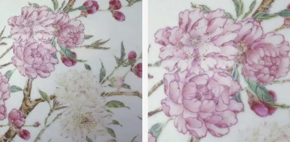 粉彩的产生在一定程度上受珐琅彩影响,但二者有显著的区别,如下: