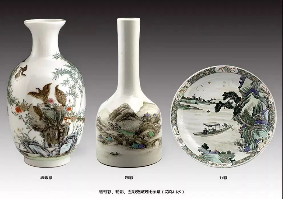 二、珐琅彩色彩凝重、鲜艳、油亮,有油画效果;粉彩淡雅、柔润、光洁,色阶变化丰富,大都具有国画效果。