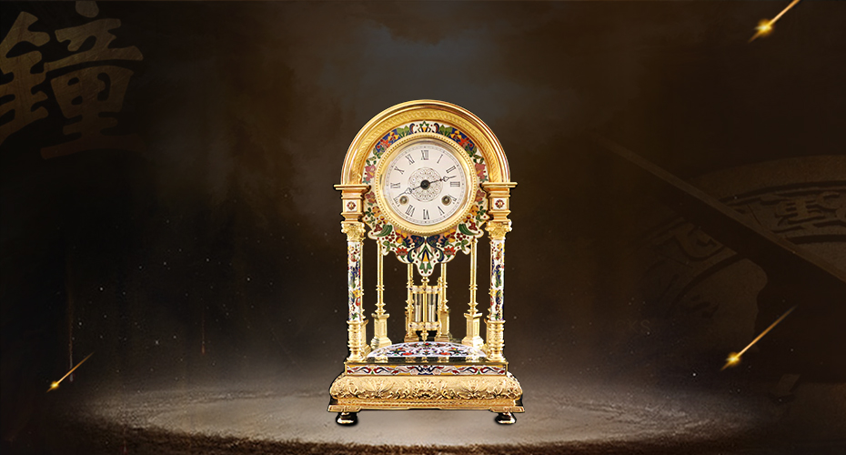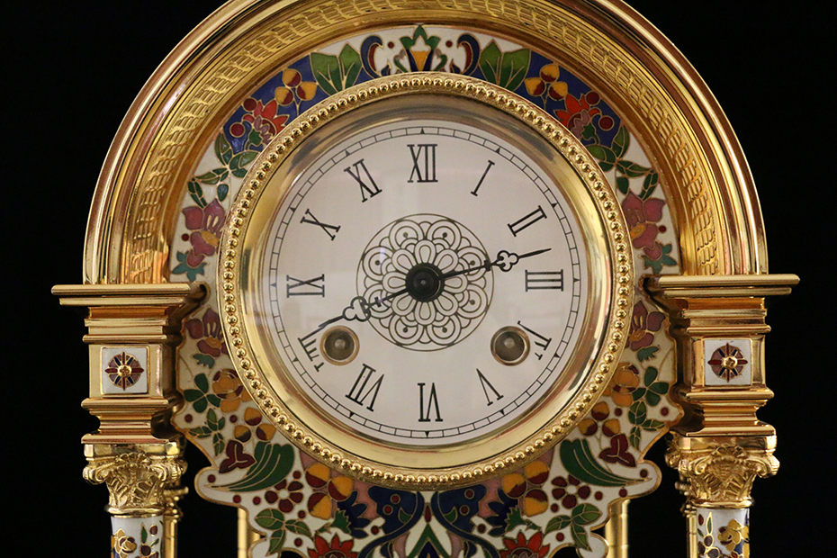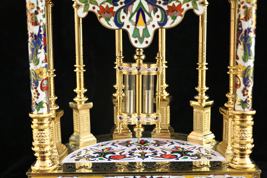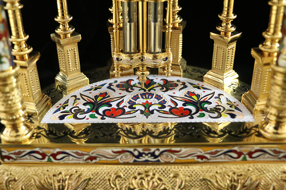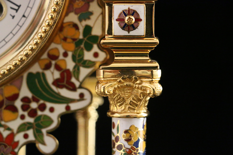 座钟正面为拱门设计,通过巧妙地留白,将珐琅工艺结合其中,并赋予绚丽饱满的色彩和丰富多样的纹饰,与精心錾刻的鎏金铜胎互相辉映,相得益彰。廊柱上悉心点缀的珐琅工艺和结合处华美的錾铜工艺,虽在方寸之间,亦极见气势。