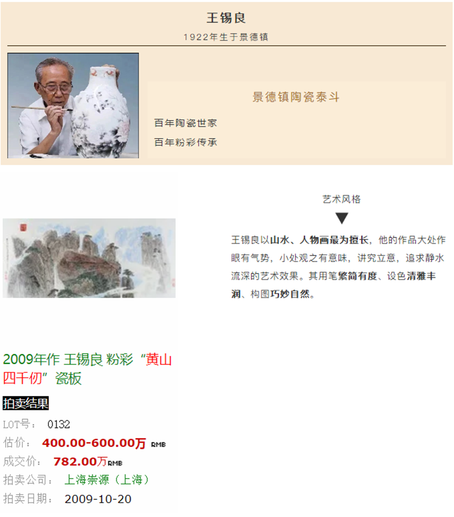 2009年王锡良粉彩“黄山四千仞”782万元成交,成为当代大师作品拍卖第一人。