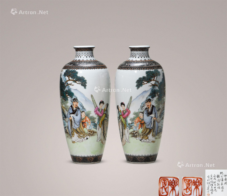 王锡良的墨彩瓶《东山行乐图》便是力作。苍劲的松树,风雅的人物,乃至人物那飘逸的衣褶,纹理清新,气韵浑成。