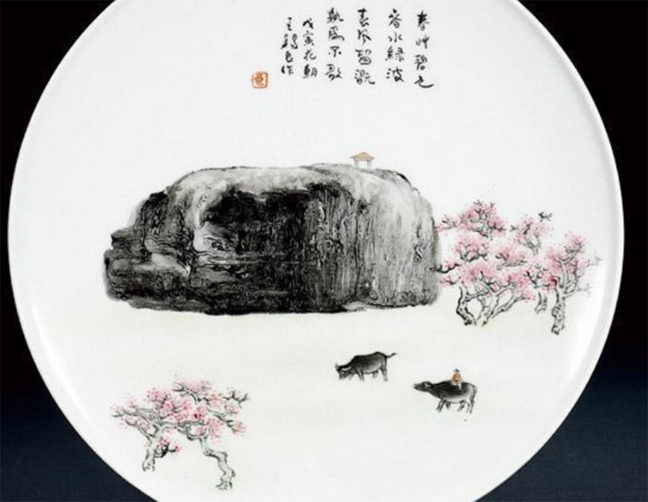 在50多年陶瓷艺术作生涯中,王锡良以山水、人物画最为擅长。他的作品大处作眼有气势,小处观之有意味,因善画中国画,刻意在陶瓷作品中揉进中国画讲求神韵、计白当黑的形式美感。