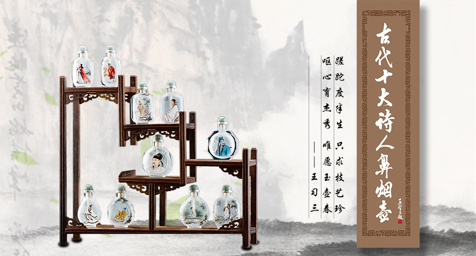 《中国古代十大诗人》鼻烟壶中国工艺美术大师、中国鼻烟壶泰斗、冀派内画的创始人王习三大师担纲艺术指导并监制创作,王又三大师携又三工作室亲自绘制《中国古代十大诗人》内画鼻烟壶。