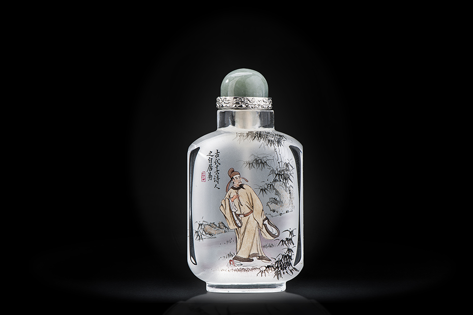 《中国古代十大诗人鼻烟壶》是用细杆勾笔伸进瓶口直径如豆粟大小的鼻烟壶内,在看不清笔尖位置的条件下于咫尺寸幅的壶腹内壁反向运笔描绘图案,其难度可想而知。这门技艺对于学习者的耐心、毅力和手上功夫的细微精确要求,几乎到了苛刻的地步,如非有多年经验且身怀绝技的大师很难成器,加上十个不同造型的壶形,更不要说是这样10个鬼斧神工的精美鼻烟壶。难得远远超过传统单一壶形,成品率不足20%。从选料到研磨无不精益求精,全程手工更是造就了独一无二的艺术价值。