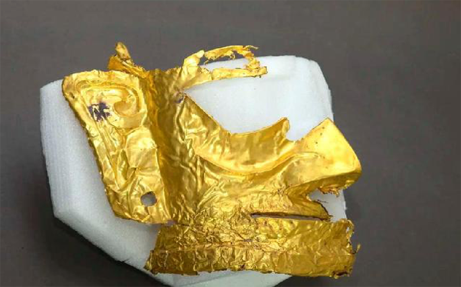 据悉,此次挖掘出的黄金面具,宽度约23厘米,高度约28厘米,无需任何支撑,就能独自立起。据推测,这副黄金面具完整重量应该超过500g。如果能发现完整的黄金面具,不仅将是国内所发现的同时期最大的黄金面具,还将是国内所发现的同时期最重的金器。