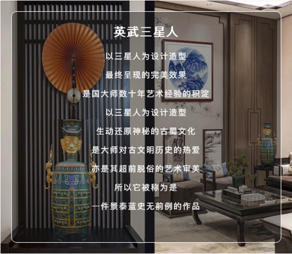作品配以景泰蓝乳钉,两侧装饰了铜扉和 雄虎戟,突出了三星将士的健美英武;