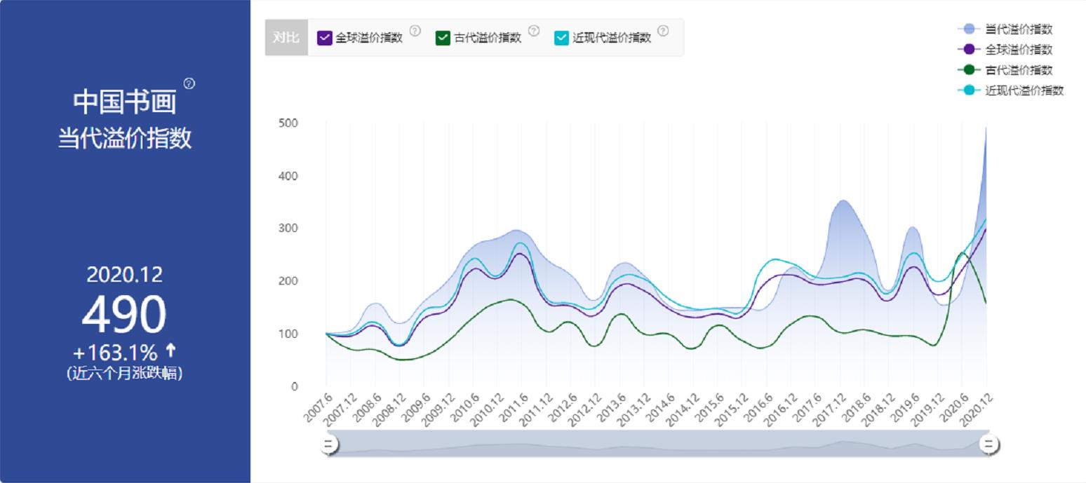 同时,中国书画在世界艺术品交易市场的影响力不可小觑。据中国权威艺术门户艺拍指数统计数据显示:截至2020年12月,中国书画的全球溢价指数高达36.3%!呈直线猛升态势。