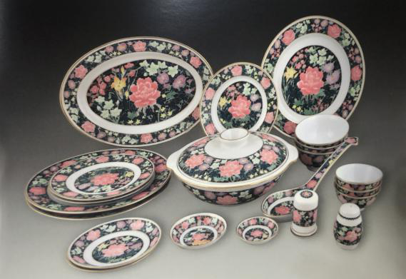 1980年,由李日铭参与设计创作的《黑地满花》餐具作为国宴瓷存放于人民大会堂118厅。