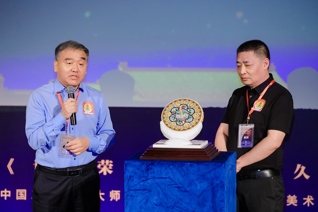 国家级非物质文化遗产景泰蓝技艺代表性传承人钟连盛(左)国家级非物质文化遗产花丝镶嵌技艺代表性传承人赵春明(右)
