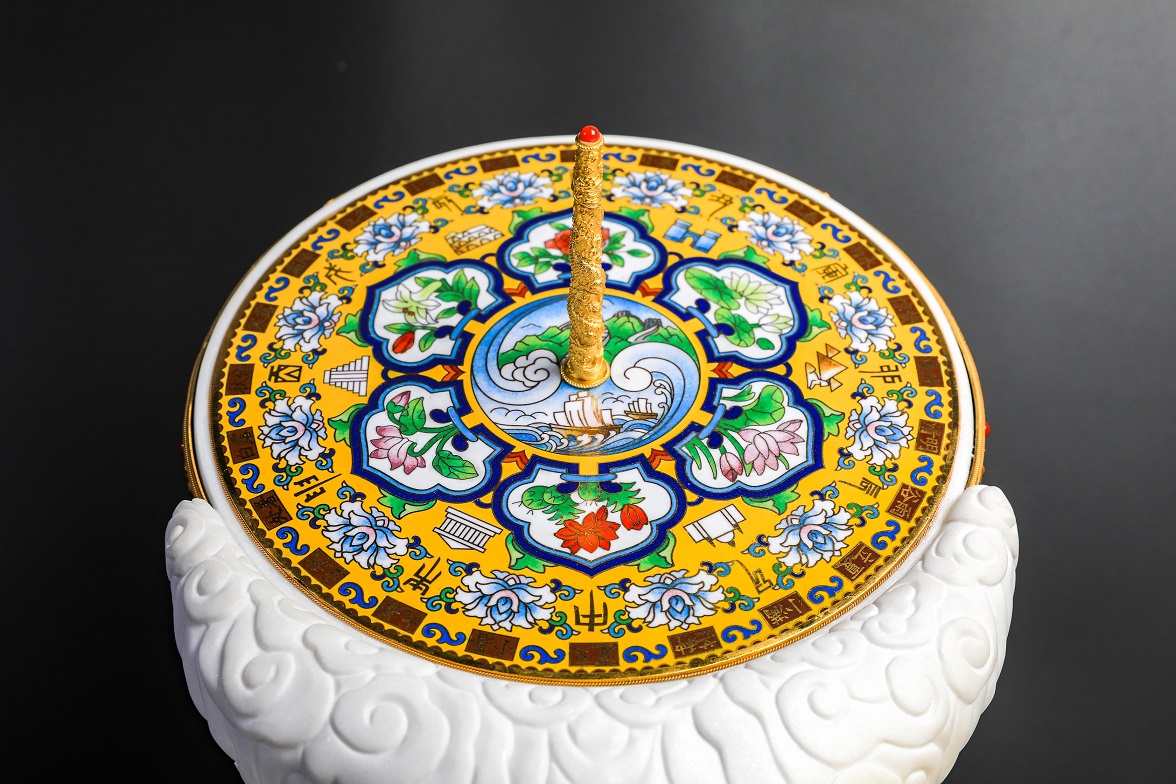 世界珐琅《世纪荣光》以故宫太和殿日晷为原型创新设计,晷盘正面以景泰蓝工艺打造,圆心以形如太极的水云纹为结构,内饰长城与宝船图案,代表海上丝绸之路和陆路丝绸之路。