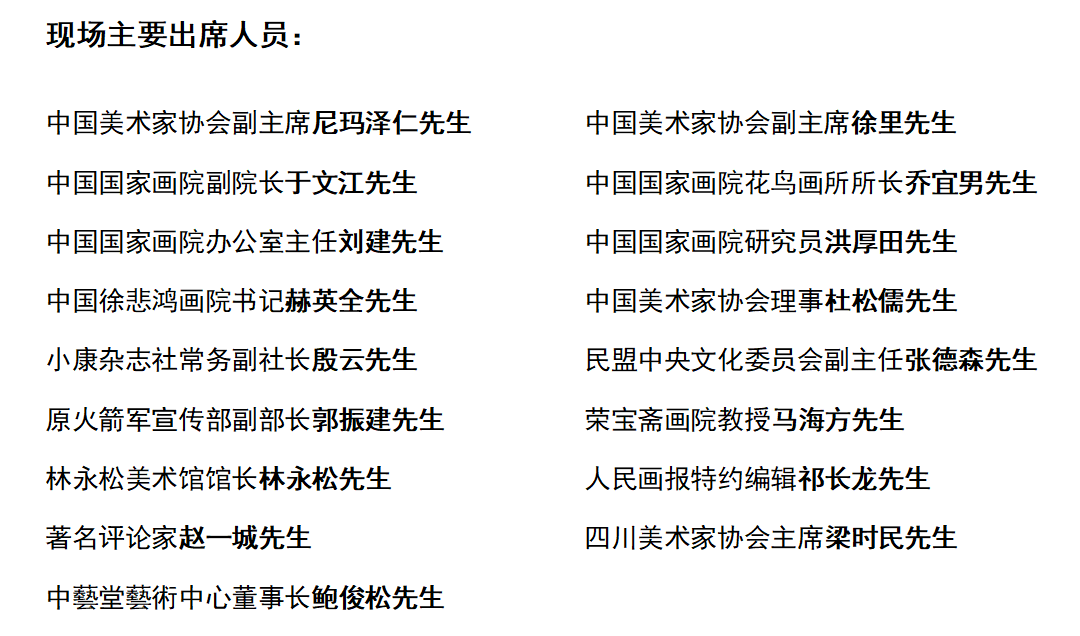 中国美术家协会副主席、中央文史馆馆员尼玛泽仁先生随后发表讲话,他表示,通过梁时民先生的作品,可以感受到梁老师对四川山水的热爱,并希望梁时民老师能用画笔,画出不一样的祖国山水。