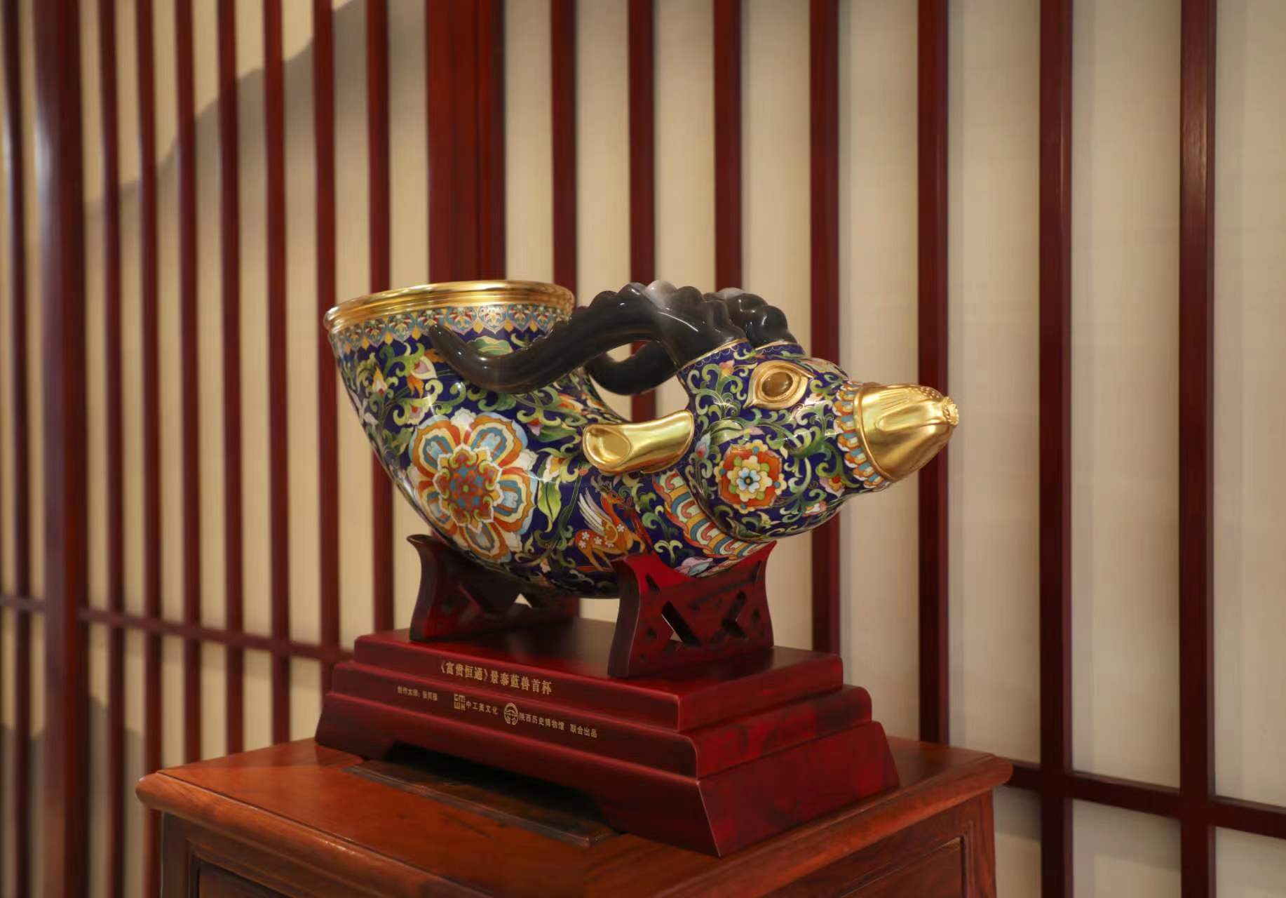 以陕西历史博物馆镇馆之宝兽首玛瑙杯为原型设计开发的《富贵恒通》景泰蓝兽首杯