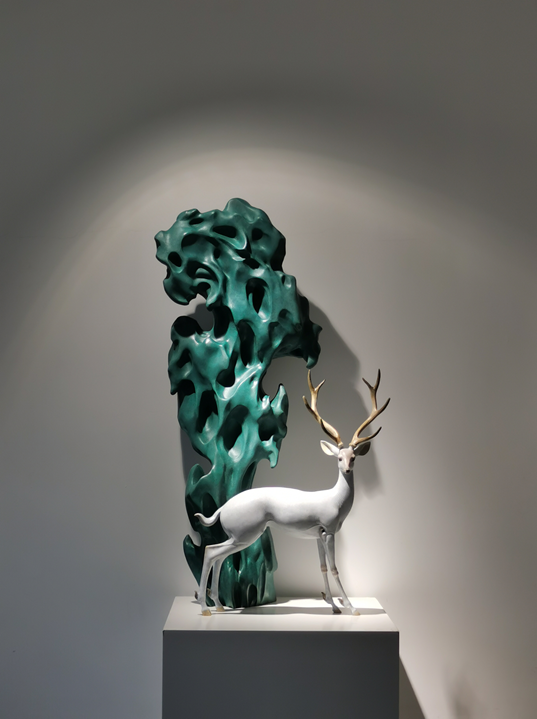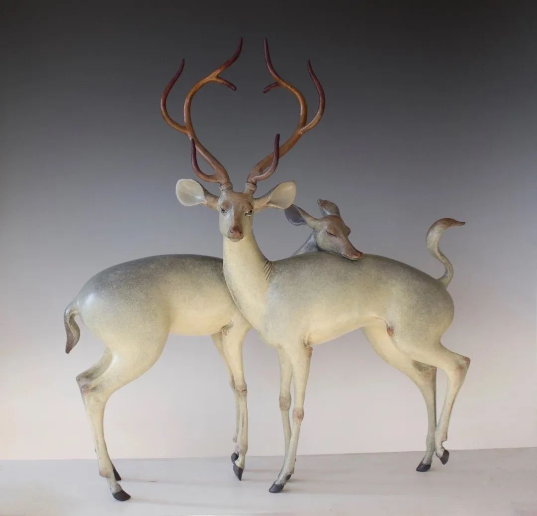 《连理》作品名字来源于白居易的《长恨歌》,在天愿作比翼鸟,在地愿为连理枝,双鹿相拥,互相依偎,远看相似两株生在在一起的古树,呼应题目,雄鹿雌鹿性格迥异,雄鹿后腿翘起,身材矫健,稳重中略带调皮,双耳张开向前,铜墙铁壁一般把同伴护在身后,保持对周围环境的警觉,体现出保护身边同伴的责任感。雌鹿优雅修长,小鸟依人,前腿踮着脚尖,头靠在雄鹿脊背上,微闭双眼,双耳向后,显示出对同伴的信任和爱慕。另外雄鹿的鹿角做了微处理,组成一个心形,这一件双鹿作品更多的是表现关于洋溢着青春气息的爱情。