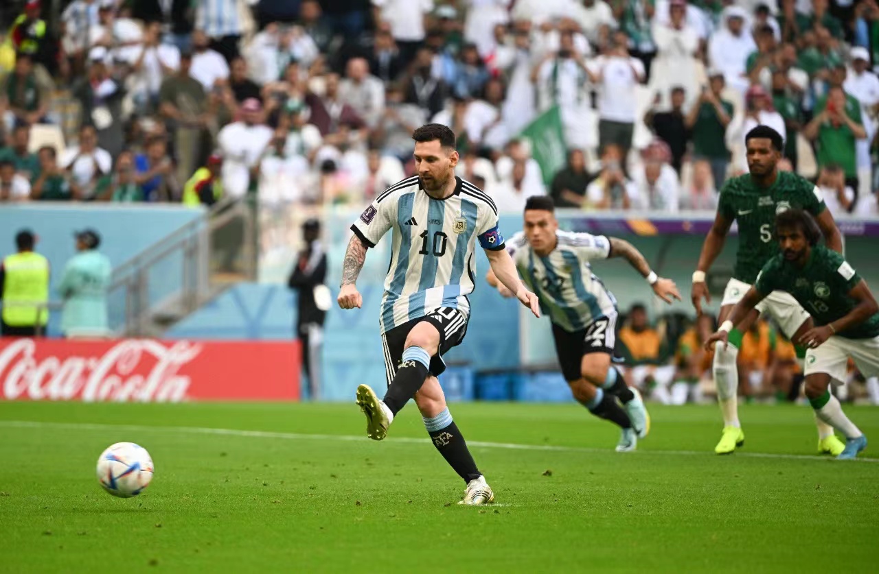 11月22日,阿根廷队球员梅西(左一)在比赛中主罚点球得分
