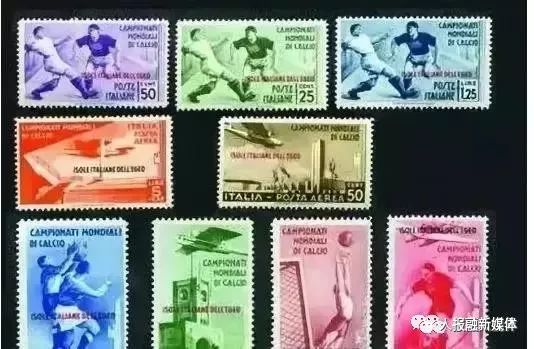 1934年,第2届世界杯足球赛由意大利主办,东道主意大利发行了5枚普通邮票,4枚航空邮票。这套“世界杯”首发邮票最新价已达到40万人民币。
