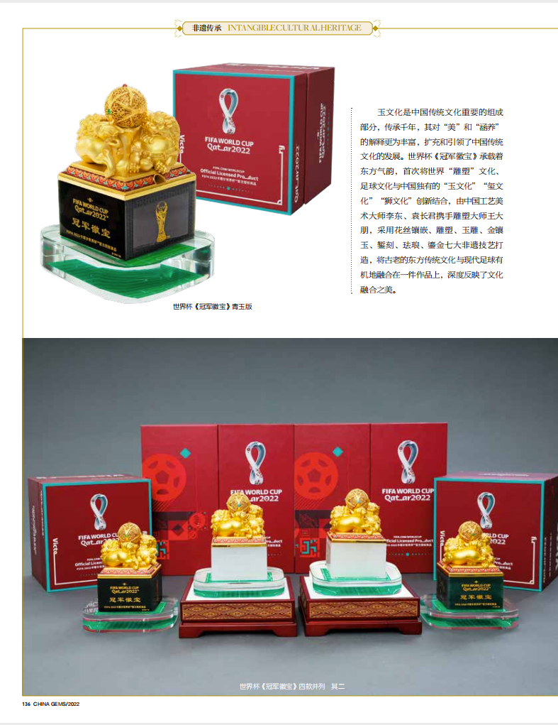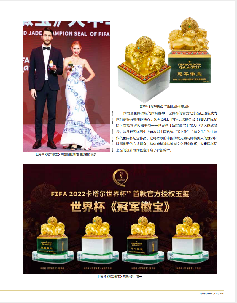 《中国宝石》CHINA GEMS第146期以“世界杯《冠军徽宝》展现中华之美,令世界感知中国”为题,用四个版面介绍了2022卡塔尔世界杯官方授权玉玺、世界杯第一玺——世界杯《冠军徽宝》的设计理念、非遗工艺、文化价值、艺术价值,赞誉其让中国传统文化与世界杯文化交相辉映,在展现中国文化软实力的同时,传递出中国非遗的声音与力量,成为讲好中国故事的艺术载体。