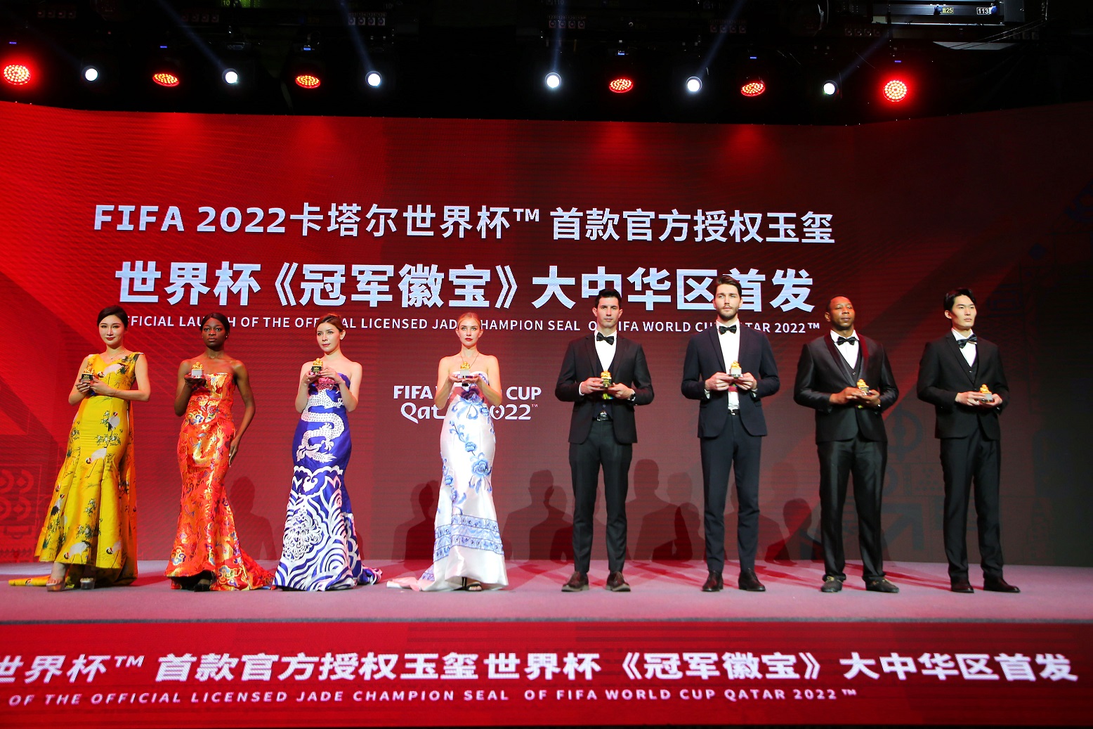 世界杯《冠军徽宝》承载着东方气韵,首次将世界“雕塑”文化、足球文化与中国独有的“玉文化”“玺文化”“狮文化”创新结合,由中国工艺美术大师李东、袁长君携手雕塑大师王大朋,采用花丝镶嵌、雕塑、玉雕、金镶玉、錾刻、珐琅、鎏金七大非遗技艺打造,将古老的东方传统文化与现代足球有机地融合在一件作品上,深度反映了文化融合之美。