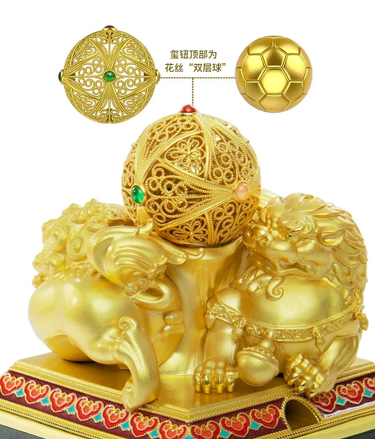 玺钮顶部球体为“双层球”,外层以卡塔尔世界杯指定用球“旅程”为原型,采用花丝镶嵌工艺打造,每个花丝部件要用0.3毫米的两股素丝经过搓丝、掐丝而成,仅外层球体就需要用到掐、填、焊、堆、垒、织、编等多种手法、二三十道工序;内层球体以传统蹴鞠为原型打造,从内到外,象征传承、传递,代表足球从发源地中国走向世界,成为了“世界第一运动”。