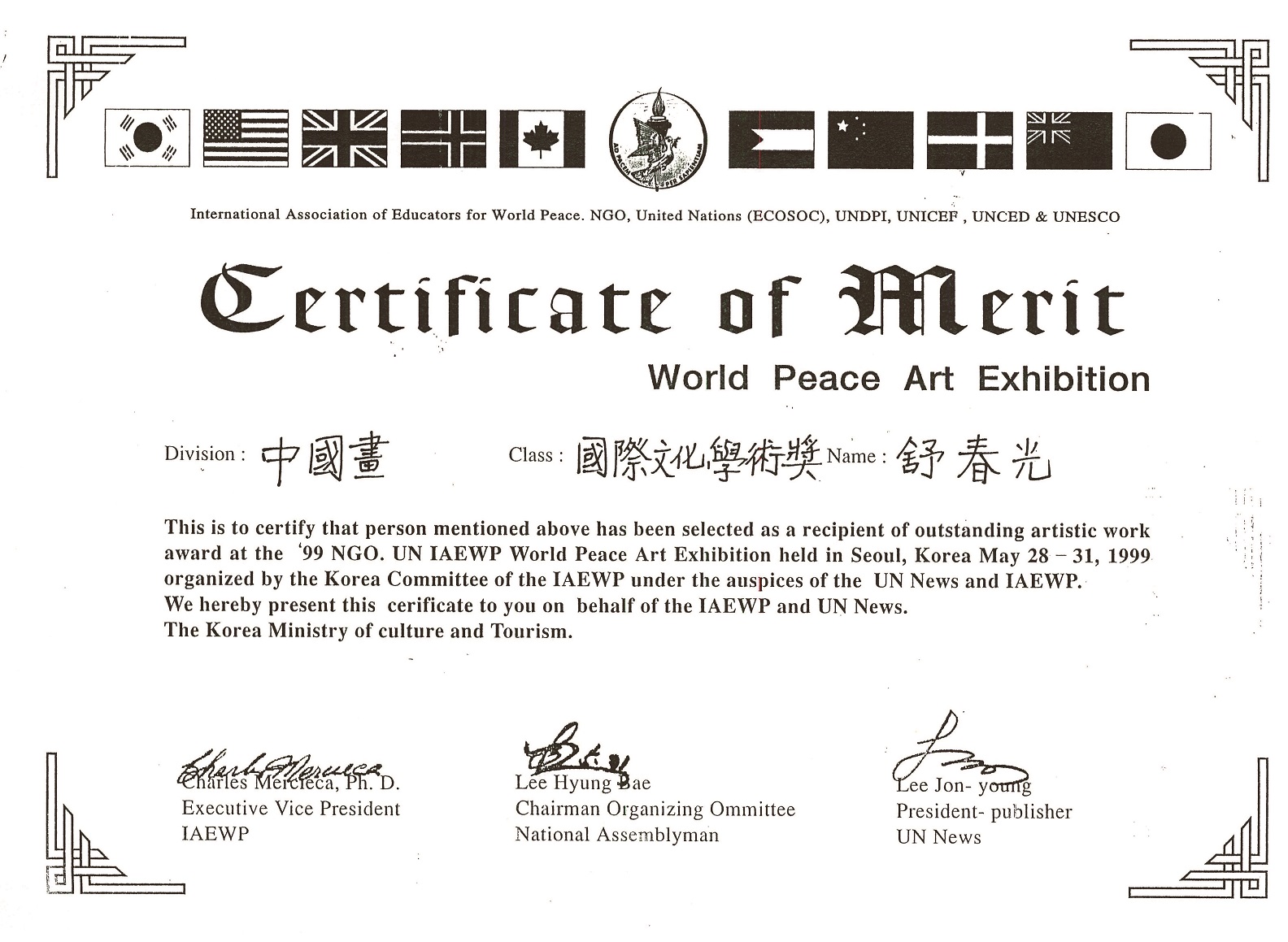 1991年舒春光荣获世界和平文化大奖,1999年荣获联合国颁布的国际和平文化学术奖。
