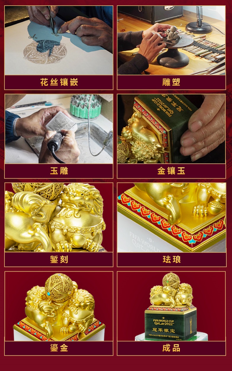 世界杯《冠军徽宝》是世界杯历史上⾸次集花丝镶嵌、⽟雕、珐琅、⾦属錾刻、⾦镶⽟、雕塑、鎏⾦七⼤顶级⼯艺于⼀玺的艺术品,是一件中华传统工艺集大成之作。每一门工艺都拥有几百甚至几千年的历史,它们或是源自宫廷皇家尊享,或是精工雕制巧夺天工,每一项技艺都是独步天下的非遗绝技。