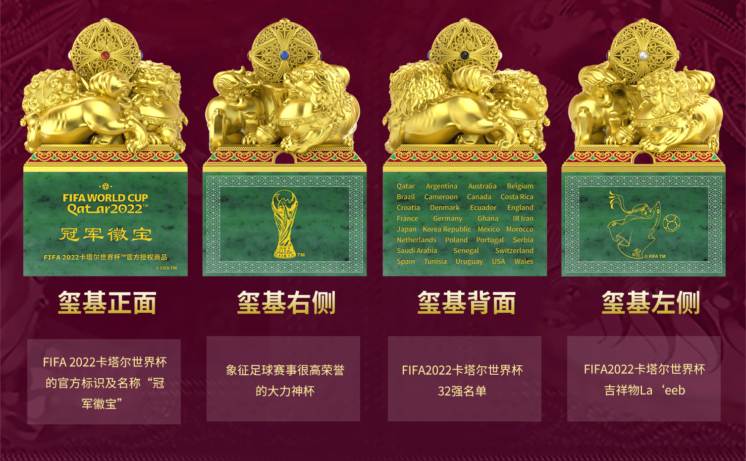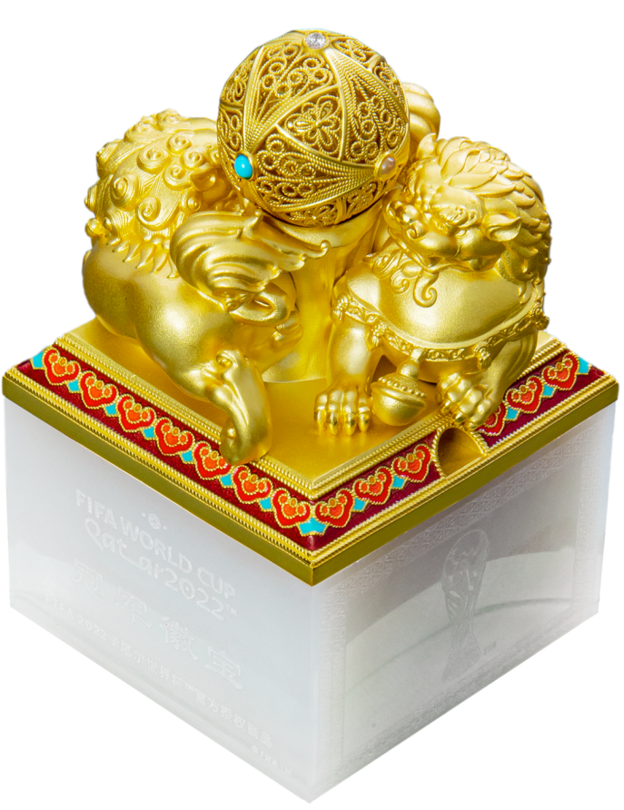 世界杯《冠军徽宝》是中国传统⽂化与世界杯的⾸次巅峰结合,作为FIFA 2022卡塔尔世界杯首款官方授权玉玺,从东方文化、中式审美、中国传统工艺等方面展现出巧夺天工、精彩绝伦的中国非遗技艺,在传统美学的思想下,追求更高的造型艺术,为非遗文化的跨界与融合开拓出更广阔的新天地。