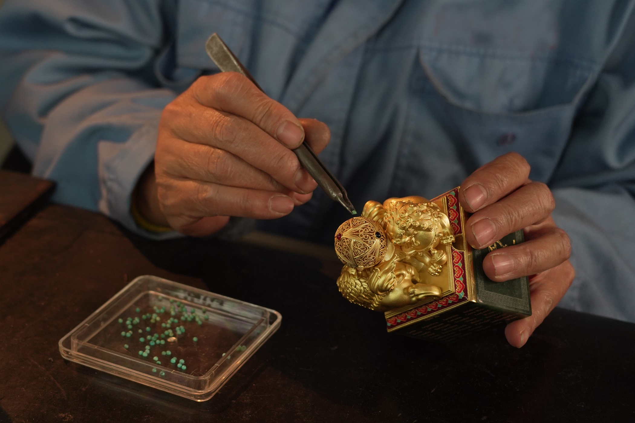 顶部球体为“双层球”,外层以花丝镶嵌工艺打造,内层为錾刻贵金属球。两层球体的设计制作极为繁复,仅外层球体就要用到掐、填、攒、焊、堆、垒、织多种手法,二三十道工序。