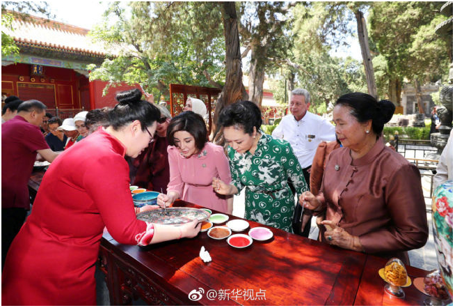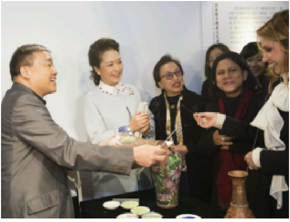 ●2017年5月,“一带一路”峰会,在故宫御花园,钟连盛大师为各国元首夫人展示景泰蓝技艺;